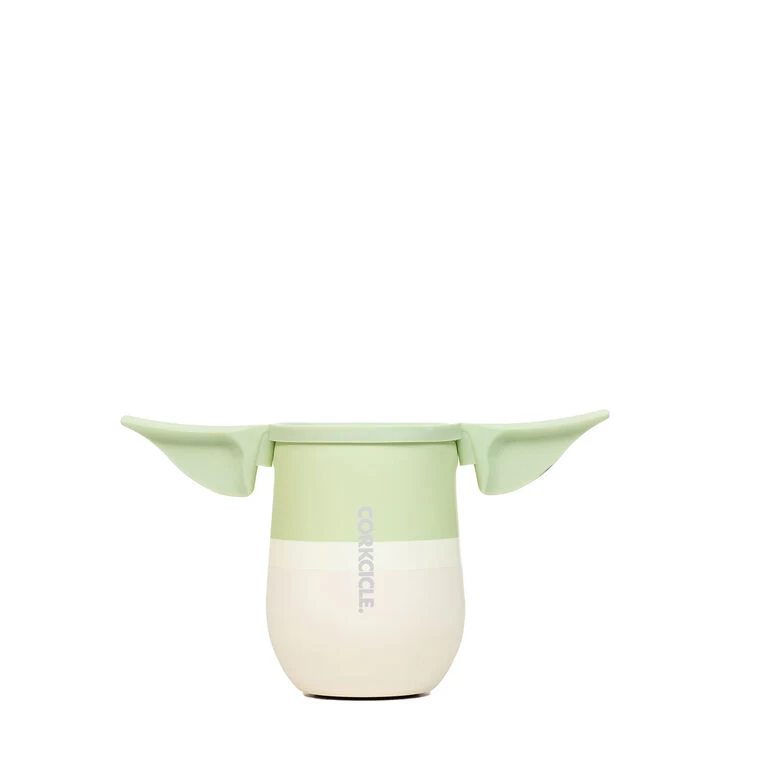Keep your beverage at its perfect sipping temperature while practicing your cup-to-mouth Force levitation skills with this fun insulated glass. Crafted from stainless steel to keep your cold drinks cool and hot drinks warm, this 12-ounce stemless glass by Corkcicle features a design inspired by Grogu, the Child from Star Wars: The Mandalorian. A clear, spill-resistant lid with silicone ears like the beloved “Baby Yoda” character lets you take your favorite beverage on the go in Star Wars style.