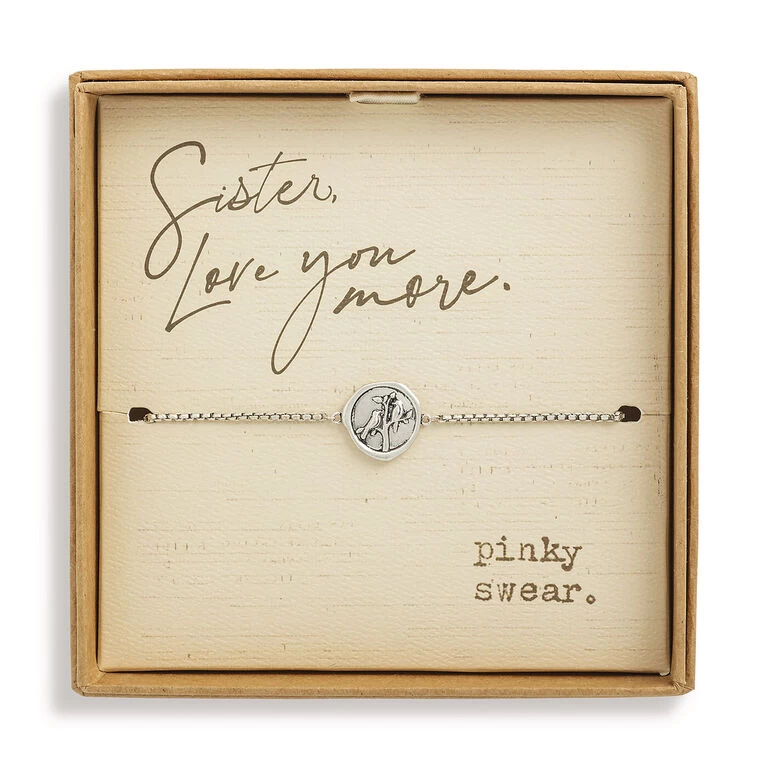 Two birds sit on the branch of the same tree in this lovely silver-finish bracelet that conveys a sweet sentiment to a beloved sister. With an irregular round shape resembling a wax letter seal, this embossed charm on silver-finish chain provides a wearable reminder of the bond you share with your sister or a friend who is like a sister. Gift-box packaging includes a letter-style message—complete with a pinky swear!