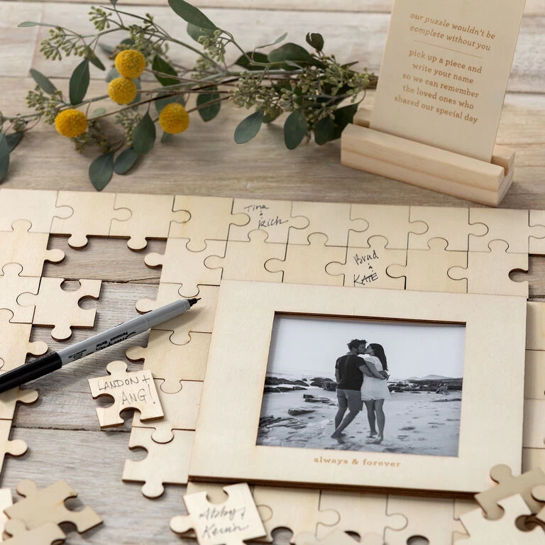 Create a keepsake on your special day that symbolically represents the importance of the love and support from your friends and family. This interactive guest book is made of classic pine wood puzzle pieces that snap together and feature a 4×4 picture frame and message.