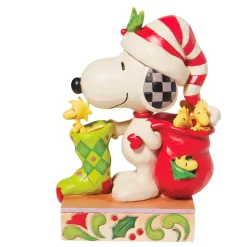 - High-quality stone resin Jim Shore Peanuts figurine features Snoopy dressed as Santa with Woodstocks in his pack and stocking.