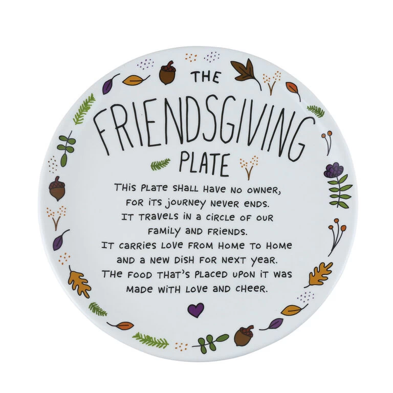 This festive plate introduces a new tradition to add to your fall and holiday get-togethers. Ceramic round plate features a charming poem about how to use the Friendsgiving plate along with a festive border of fall leaves, acorns, and flowers. Bring the plate to your next gathering and leave it with love to be shared again and again with friends and family.