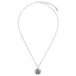 - Silver-finished brass necklace features charm with floral design.