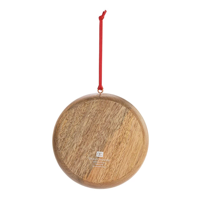 • Round ceramic ornament features cardinals and bear in a distressed wood frame.