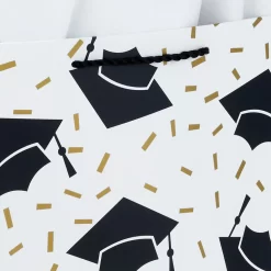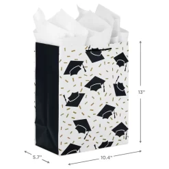- Large graduation gift bag pack includes 3 assorted designs: tossed grad caps on white, mortarboard on stripes and gold foil banner on black.