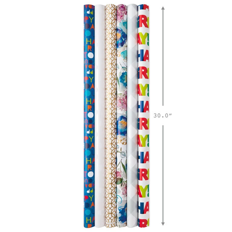 - Pack includes 6 rolls of heavyweight wrapping paper with cut lines on reverse.
