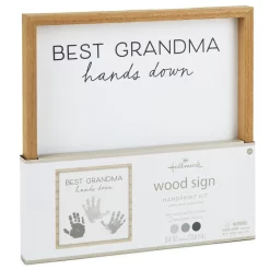 - Handprint sign kit includes wood-framed sign and 3 tubes of nontoxic paint to capture grandkids’ handprints.