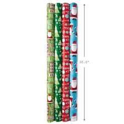- Pack includes 4 reversible wrapping paper rolls in assorted holiday designs: Santa lettering on green/candy canes on red, mints and messages on red/red and green stripes, patterned trees on green/snowflakes on blue, waving Santas on blue/dots on red.