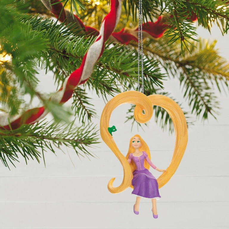 Be inspired to follow your dreams when you hang this “Tangled” Christmas tree ornament. Rapunzel and her chameleon pal Pascal make good use of the optimistic princess’s long golden hair by forming a heart-shaped swing in this fun decoration.