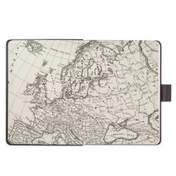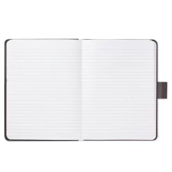 - Simulated leather journal features black compass design on gray cover and a pen holder.