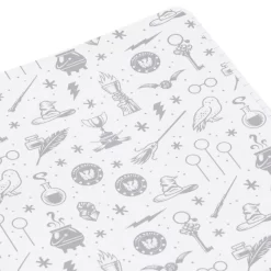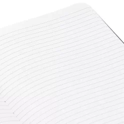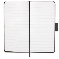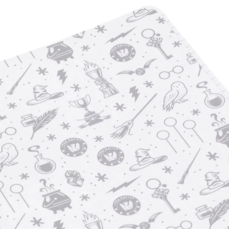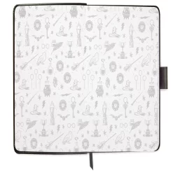 - Harry Potter notebook in black faux leather includes a pen loop and endliners designed with Harry Potter icons.