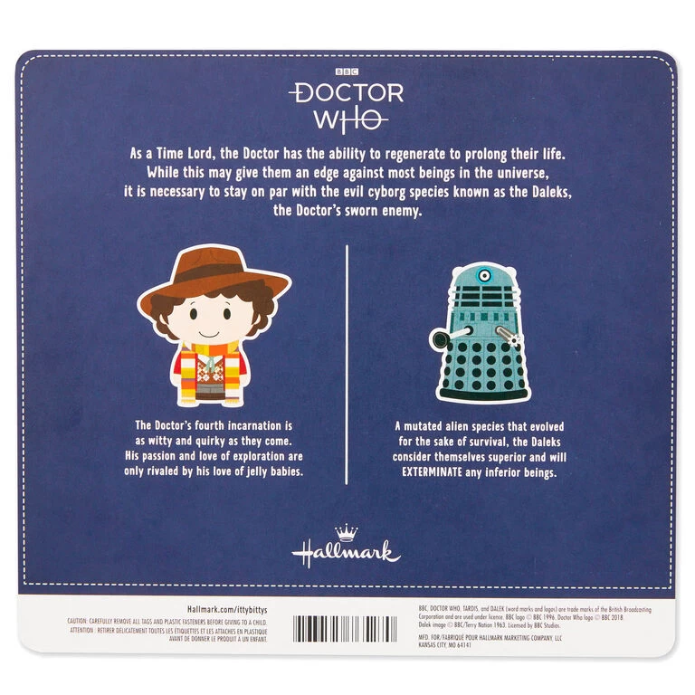 - itty bittys Doctor Who plush set includes 2 characters crafted from soft fabric: The Fourth Doctor and a Dalek.