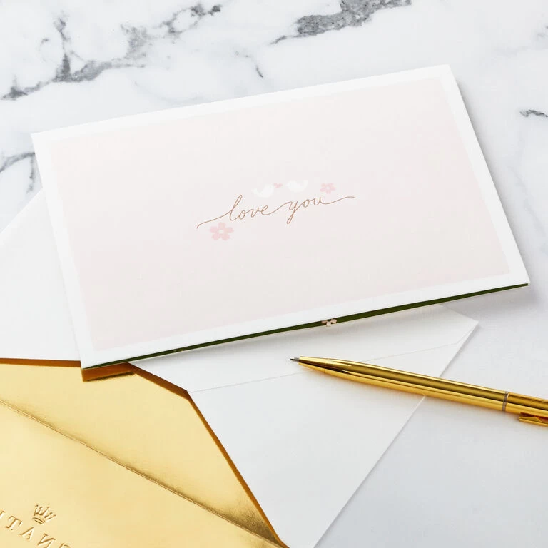 Pop-up Valentine’s Day greeting card features a “Love you” message and tiny white birds on a soft pink background. Simply open the card to reveal the 3D pop-up surprise inside—no assembly required: an intricate, laser-cut cherry tree pops up, with a froth of pink glittery blooms and a white swing hanging from its branches. This romantic card crafted from premium card stock is a work of art sure to be displayed all year long, making it an unforgettable way to share a message of love on Valentine’s Day. When open, card lays flat for display; 3D pop-up inside measures approx. 5.75″ H.