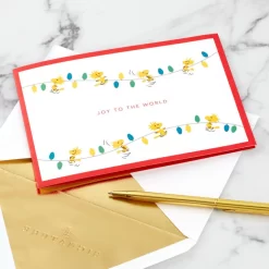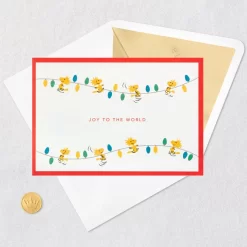 Pop-up Christmas greeting card features Woodstock’s feathered friends dancing around a string of Christmas lights with a “Joy to the World” message on the front. Simply open the card to reveal the 3D pop-up surprise insideāno assembly required: an intricate, laser-cut scene of Snoopy and Woodstock sitting atop Snoopy’s decorated doghouse pops out with sparkling glitter accents. This lovely card crafted from premium card stock is a work of art sure to be displayed all season long. When open, card lays flat for display; 3D pop-up inside measures approx. 5.5″ H.