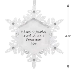 Mark an anniversary, give a romantic holiday gift, or celebrate the life of a loved one with this personalized Christmas tree ornament. This elegant, shimmering snowflake features gem accents and space to add a name, date or short message.