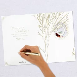 Pop-up Christmas greeting card features Santa Claus delivering presents under a light-up Christmas tree set in a three-dimensional, laser-cut diorama. Musical card plays the song “O Christmas Tree” and lights up when button on front is pressed. Delicate die-cut details adorn the sides to extend the shadow box scene and create a lovely display from any angle. Simply unfold the card to create a peek-through shadow box display—no assembly required. When open for display, 3D pop-up card measures approx. 6″ H.