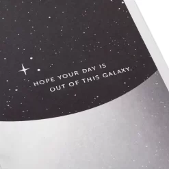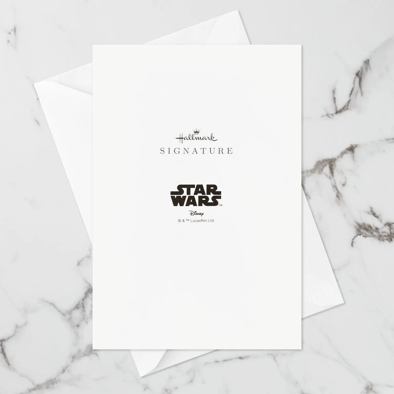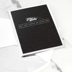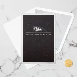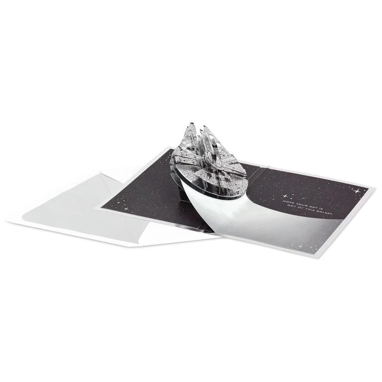 Pop-up greeting card features an image of the Millennium Falcon and a “May the Force be with you” message in silver foil on the front. Simply open the card to reveal the 3D pop-up surprise inside—no assembly required: an intricate, laser-cut Millennium Falcon pops out and the iconic ship appears to fly off into space. Silver foil accents and star icons add to the fun. This epic card crafted from premium card stock is a work of art sure to be displayed all year long, making it an unforgettable way to celebrate a Star Wars fan on Father’s Day, a birthday or any day. When open, this pop-up card lays flat for display; 3D pop-up inside measures approx. 2″ tall.