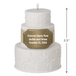 Add a special touch to your first holiday season together with this personalized Christmas tree ornament. The pretty ceramic three-tier wedding cake design features a metal accent to customize with a name, date or personal message. Makes a heartfelt bridal shower or wedding gift for newlyweds.
