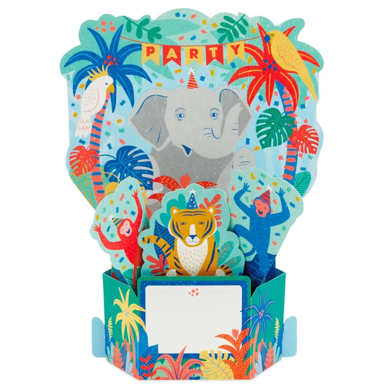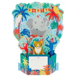 Pop-up birthday cards pack features a three-dimensional, laser-cut design of wild animals having a party among tropical trees and plants on a green designed base. Simply pull down on sides of cards and push up base to pop open and lock into place—no assembly required. Vibrant card with space on back for your personal message makes a fun birthday choice for friends, family members and kids.