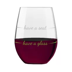 Mix mischief and moderation with this nicely weighted 16-oz. wine glass. Featuring a signature âperfect pourâ line at 6 oz. and another line at 10 oz., this humorous glass with a play on words is designed to keep you on your toes, or at least on your feet. Mind the line and youâll be fine! This fun stemless glass makes the perfect gift for mom, dad, a college graduate and more.
