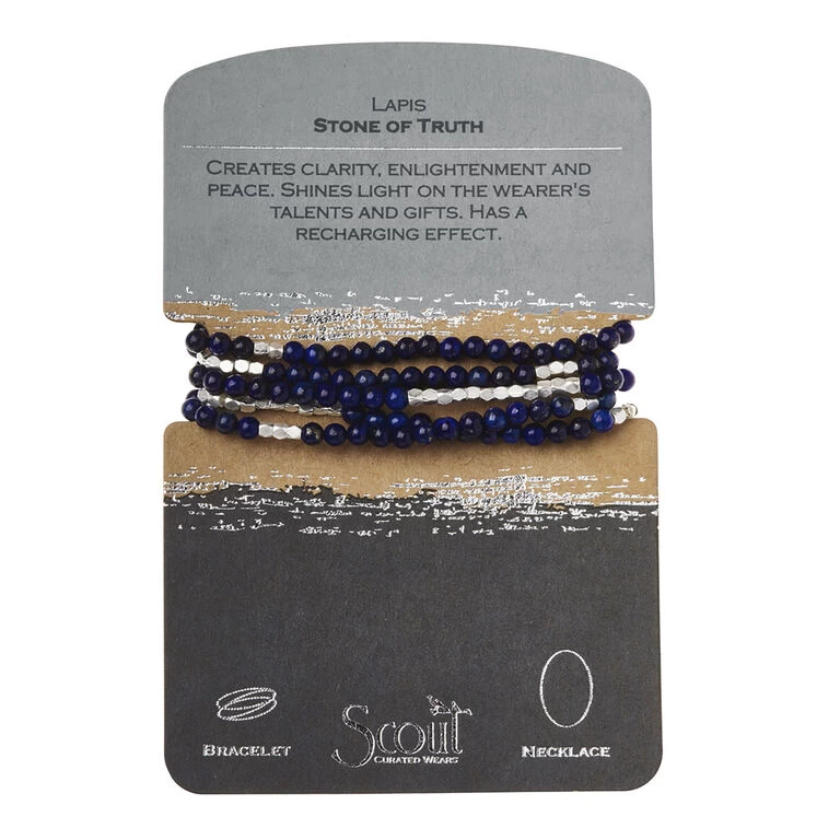 Accessorize creatively with this semi-precious stone wrap by Scout Curated Wears that can be worn as a bracelet or a necklace. Channel clarity and enlightenment when you wear this lovely wrap that’s made of lapis stones and sprinkled with silver-tone beads for shine. Wrap several times around your wrist to wear as a bracelet, or one or two times to wear as a necklace. Presented on a gift card that shares the meaning of each stone. This convertible jewelry wrap makes a great gift or a fun addition to your own jewelry collection!