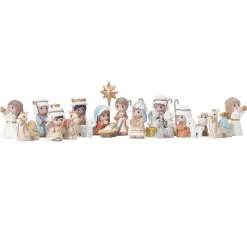 - Precious Moments Nativity set of resin figurines featuring handpainted details and wood display case.