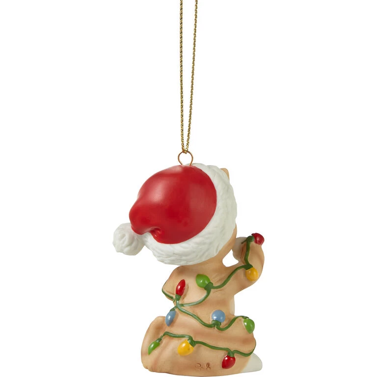 - Precious Moments Christmas tree ornament with hand-painted details features a kitty in a Santa hat, wrapped in Christmas lights.