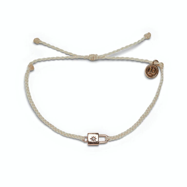 • Pura Vida ivory braided string bracelet with rose gold and rhinestone lock charm.