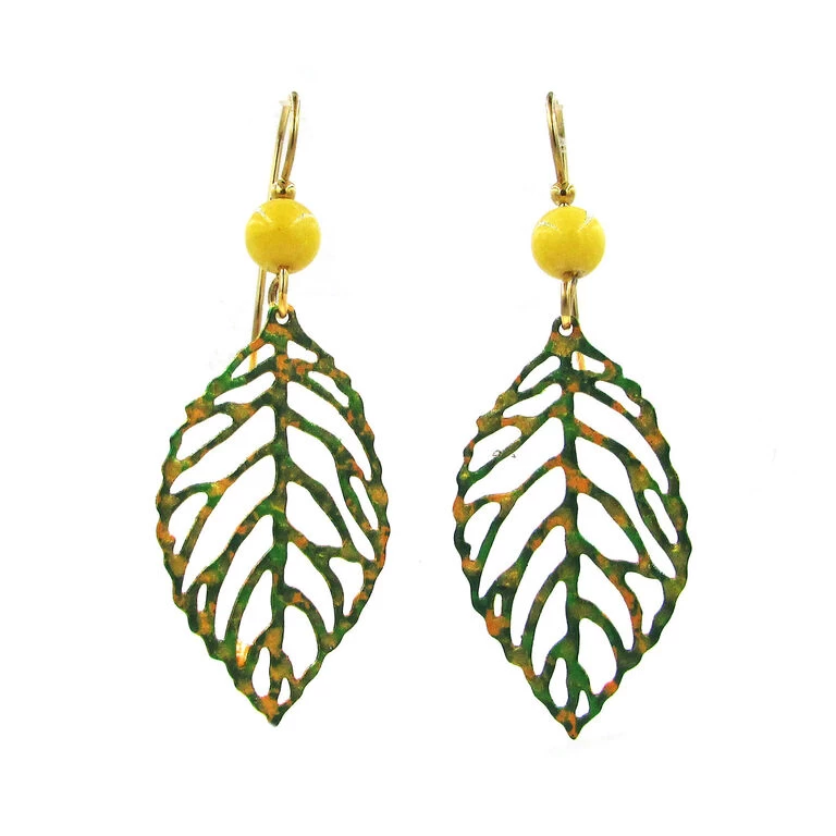 Give your outfit a nod to nature with this vibrant metal accessory. These high-quality, hypoallergenic earrings feature a variegated green open leaf design with a vibrant yellow accent bead that can be worn with any outfit. The handcrafted, wearable art is set on 18K gold-plated surgical steel hooks for metal sensitivities and a must-have accessory for anyone’s collection.