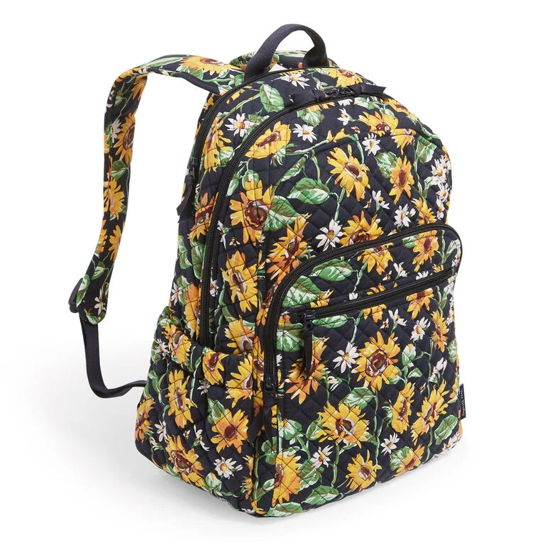 Whether it’s to school, work or road trip, you’re ready to go places with this lightweight, packable backpack from Vera Bradley. Plenty of pockets and compartments help you organize everything you’ll need and carry it in a quilted black sunflower package made of lightweight, recycled cotton fabric. Convenient features include a separate, padded compartment for a laptop or tablet, padded shoulder straps shaped for comfort, and a trolley sleeve to slide the bag over a luggage handle. Get moving in style!