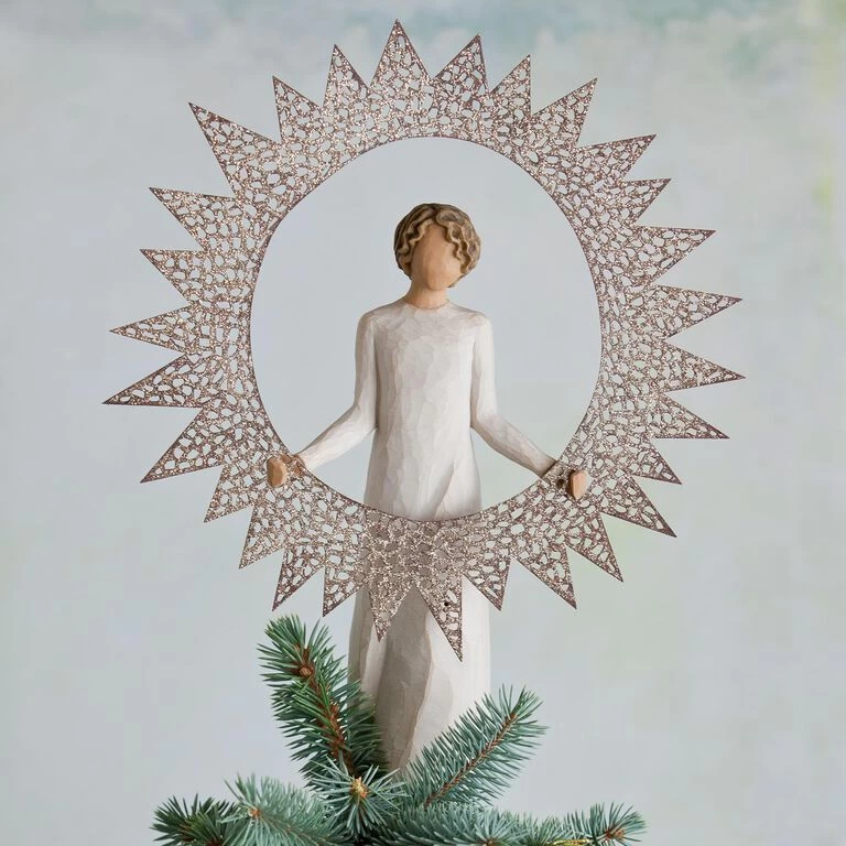 This 12-inch tree topper holds a delicate, pierced metal star encrusted with glitter that catches the light and sparkles at every angle. The inside of the figure is hollow to accommodate the top branch of the tree. She can also stand as a figureāa warm invitation to gather and celebrate the holiday.